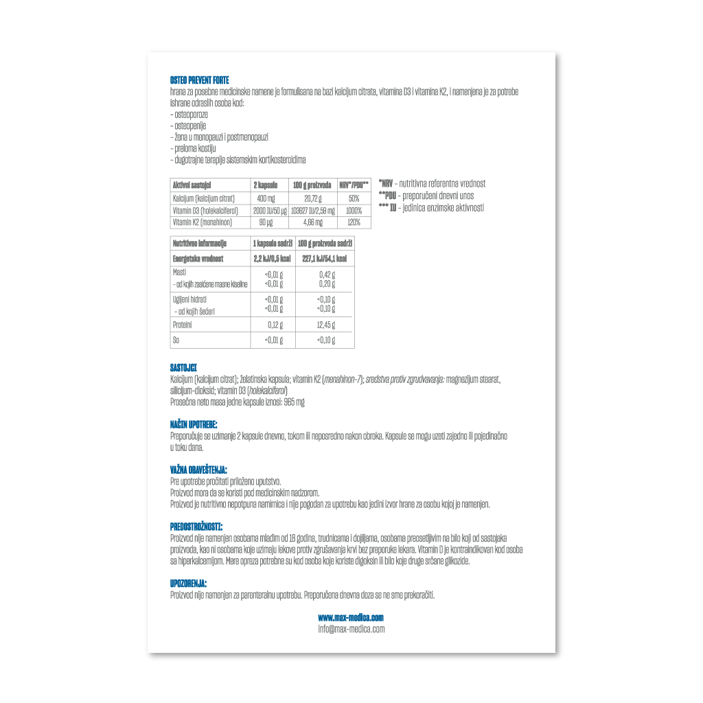 Osteo Prevent Forte je formulisan na bazi kalcijum citrata, vitamina D3 i vitamina K2, koji sinergistički doprinose očuvanju strukture kostiju i prevenciji osteoporoze.