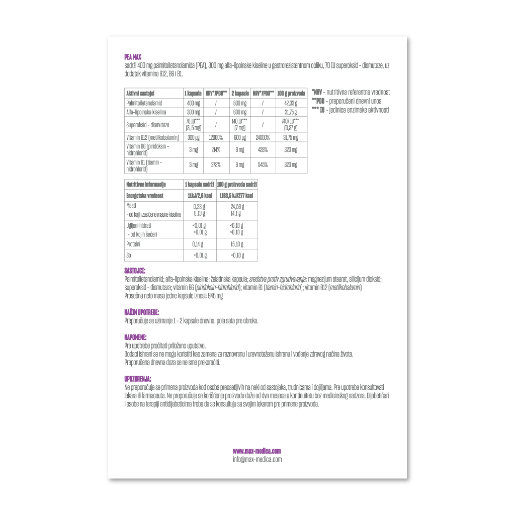 Pea Max je formulisan na bazi palmitoiletanolamida (PEA), alfa-lipoinske kiseline u gastrorezistentnom obliku i superoksid - dismutaze, uz dodatak vitamina B12, B6 i B1. Namenjen je za ublažavanje hroničnog bola, koji se javlja kao posledica hroničnih inflamatornih bolesti i stanja.