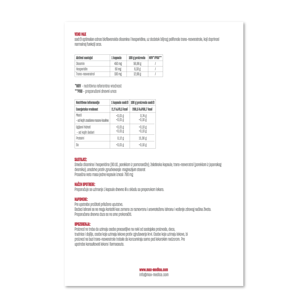 Veno Max sadrži optimalan odnos bioflavonoida diosmina i hesperidina, uz dodatak biljnog polifenola trans-resveratrola. Namenjen je za tretman venske insuficijencije i hemoroida.